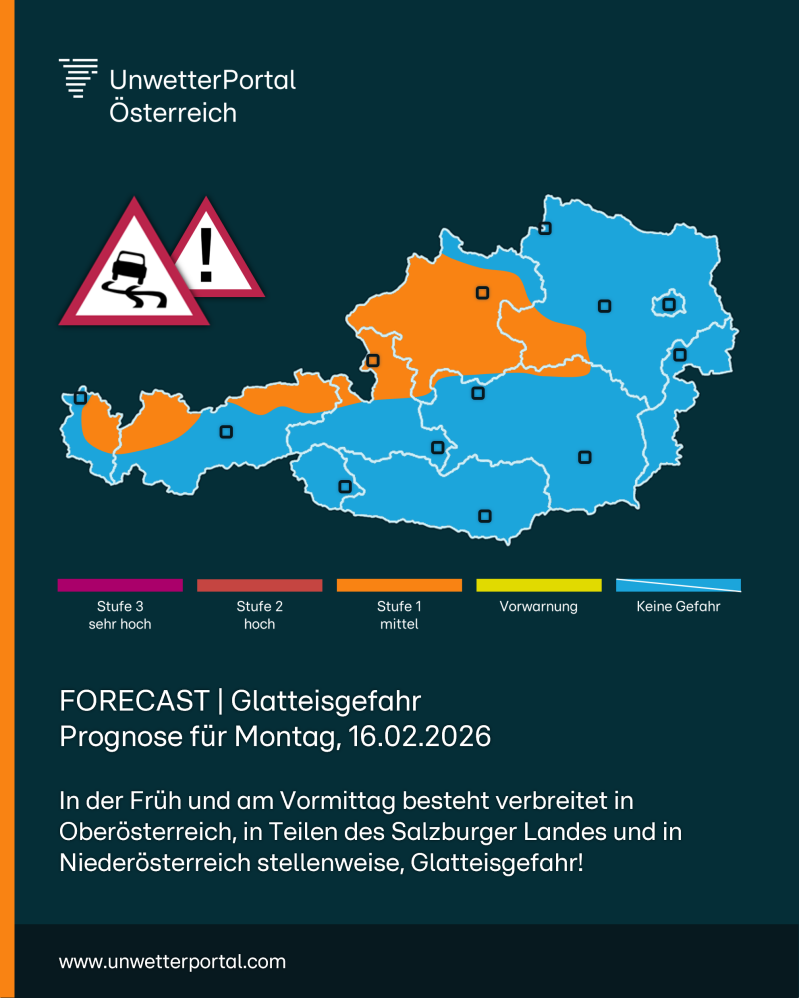 Die nächste Störungszone erreicht uns in der Nacht zu Montag, dabei fällt von Vorarlberg bis ins Waldviertel und in die Obersteiermark immer wieder Regen und Schneefall. Kräftiger Westwind bringt dabei wieder deutlich mildere Luft, die Schneefallgrenze steigt am Vormittag von Westen her auf 600 bis 1300 Meter. Im Übergangsbereich von Schneefall zu Regen besteht bis Mittag erhöhte Glatteisgefahr.