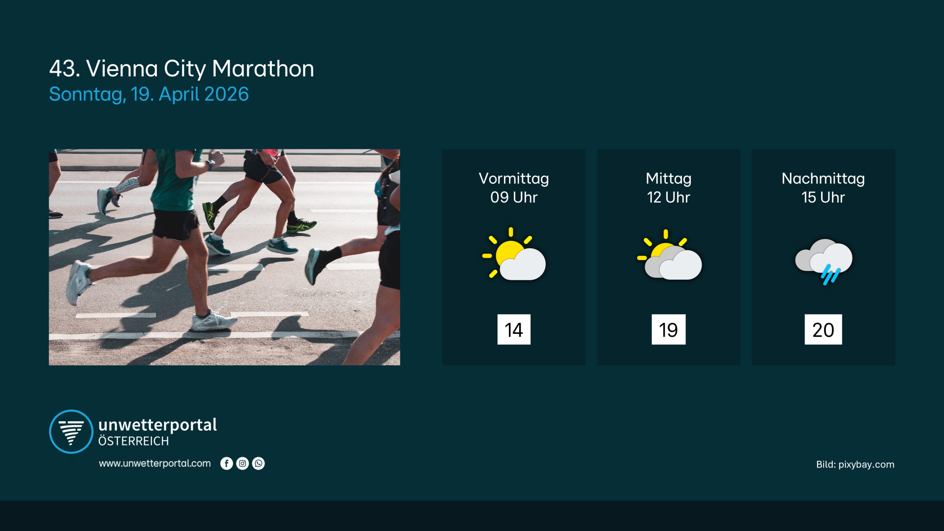 Am Sonntag startet der große Marathon um 9 Uhr bei einem Sonne-Wolken-Mix und angenehmen Temperaturen um 14 Grad 🌤️. Mit Annäherung einer Kaltfront aus Westen, werden die Wolken nach und nach mehr, der Sonnenschein weniger ⛅. Zu Mittag werden Temperaturen um 19 Grad erwartet, der Wind ist meist schwach. Wer schnell ist, kommt sicher noch trocken in das Ziel ☝️, ab 14 Uhr steigt die Schauerneigung deutlich an. Dann dreht auch der Wind auf West und frischt auf.