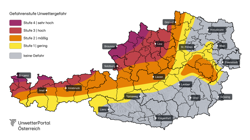 So sieht ein tagesaktueller Forecast für Österreich aus, welcher meist am Vormittag bei Unwettergefahr ausgegeben wird. Anhand der Gefahrenstufen 1-4 kann man erkennen, in welchen Gebieten es heftig werden könnte.