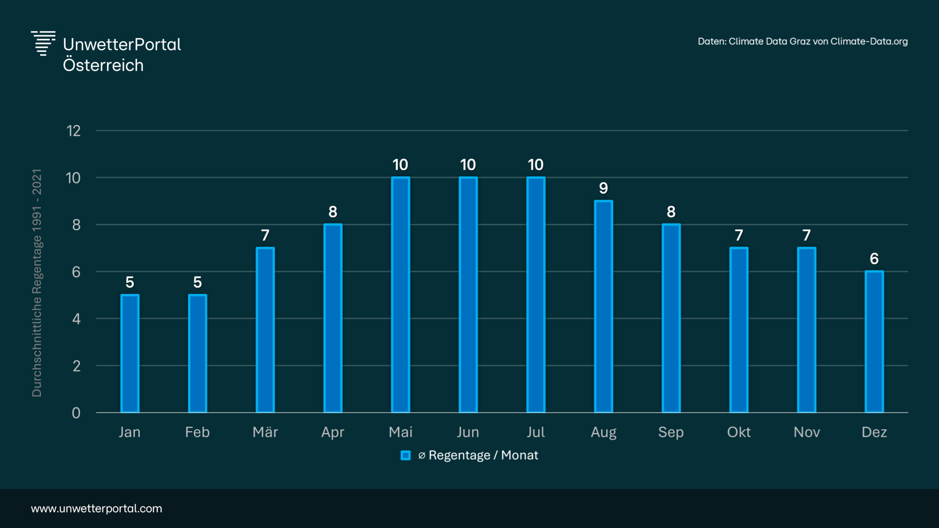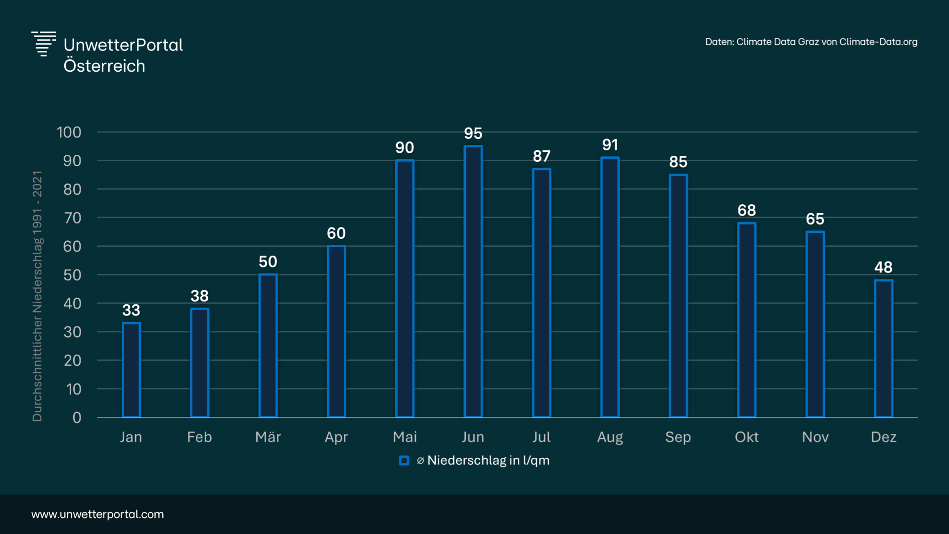 Daten: 1991 - 2021 Min. Temperatur °C, Max. Temperatur °C, Niederschlag / Regenfall mm, Luftfeuchtigkeit, Regentage (gerundet).